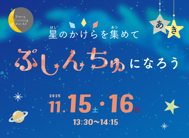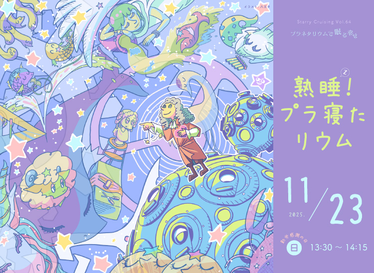 Schedule 今シーズンの上映スケジュール 上映スケジュールを見る 作品一覧を見る News 新着情報 2025/10/21 【お知らせ】年末年始の営業日について 2025/10/23 【イベント】11/23(日・祝)「熟睡プラ寝たリウム」開催 2025/10/12 【お知らせ】11/20「はじめまして、プラネタリウム」 2025/10/10 【お知らせ】11/9、10スケジュール変更 2025/10/10 【イベント】11/15、16「星のかけらを集めてぷしんちゅになろう~あき~」 2025/09/28 【イベント】10/31「Halloween Night」(R15)開催 詳しく見る